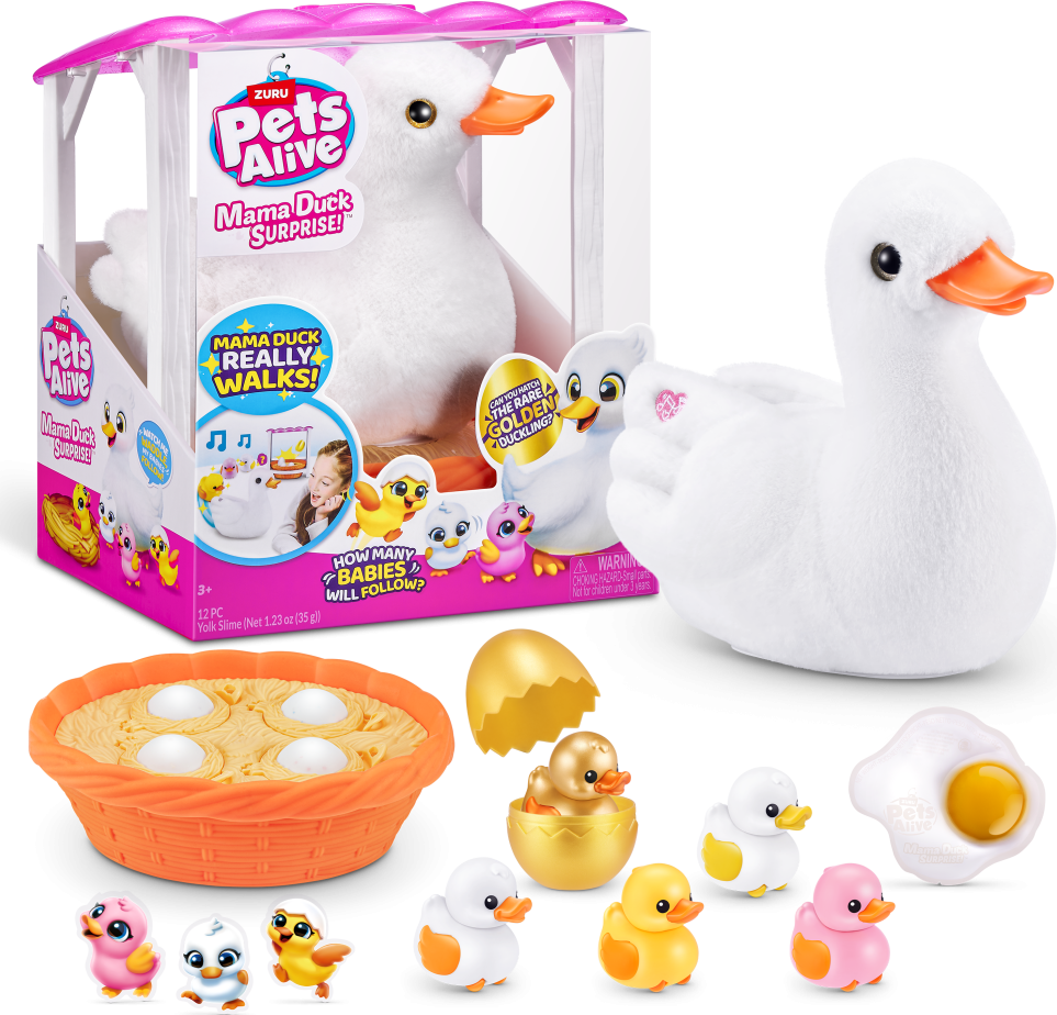 Plyšová kachní maminka s kačátky Pets Alive – nově vylíhlá mláďata si chtějí hrát! Ale kolik malých kachniček se vylíhlo? 2, 3 nebo 4? Ve vajíčku můžete najít překvapivý sliz nebo roztomilé nálepky! Mama Duck je plná překvapení a ráda bere své malé kachničky všude s sebou. Sledujte, jak roztomilé malé kačenky běží za kolébavou chůzí za svojí maminkou.