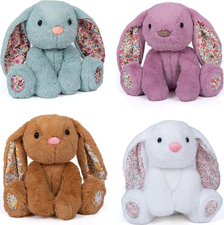 Plyšový králík s látkovýma ušima 25 cm – čtyři barvy bílá, růžová, hnědá a modrá.
