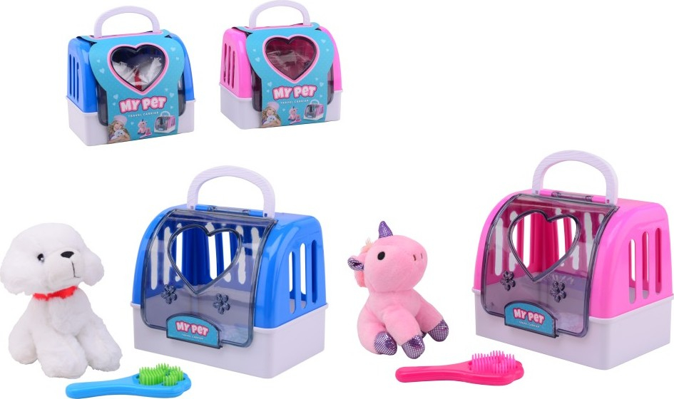 Plyšový pejsek/jednorožec v přepravce pro všechny kdo cestují a chtějí si vozit své plyšové mazlíčky s sebou.