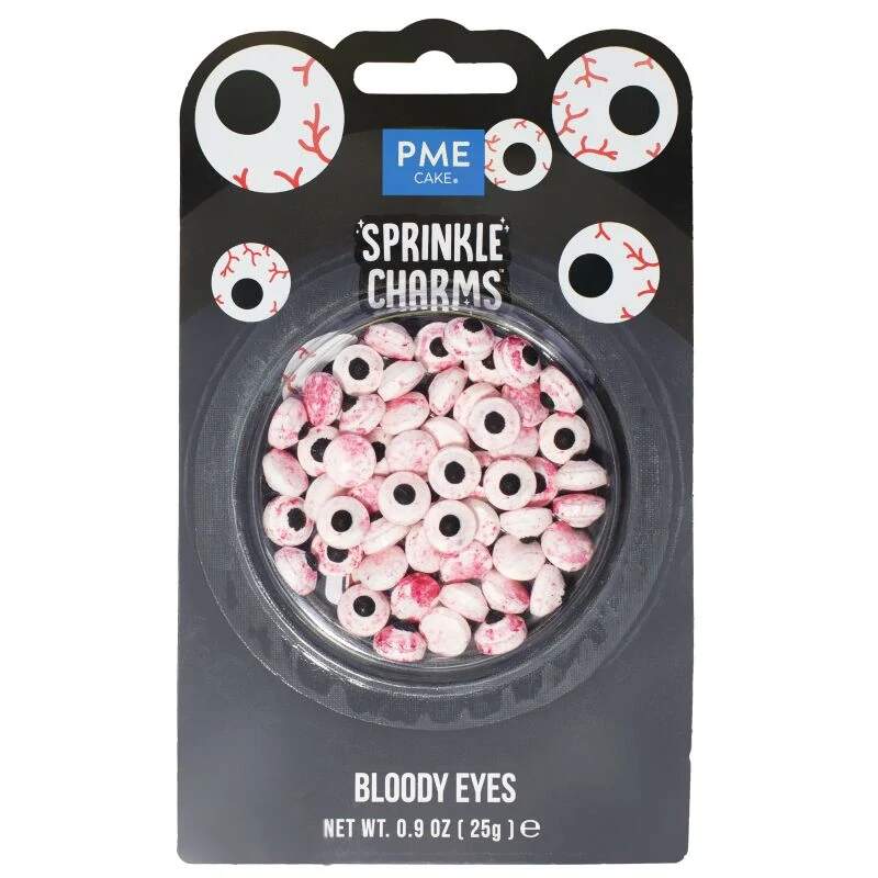 Přidejte špetku strašidelné zábavy do svých halloweenských dobrot. Tyto krvavé oči budou tím nejděsivějším zakončením vašeho pečení! Skvěle doplní vzhled cupcaků, sušenek, dezertů a také rozmanitých pochoutek. Ať už jdete na halloweenskou párty, nebo ji pořádáte sami, vaše sladkosti budou mít ten správný strašidelný šmrnc. Balení obsahuje 25g cukrových krvavých očí o velikosti 10 mm. (přibližně 50 - 60 ks). Bez azo-barviv. Složení: dextróza, kukuřičný škrob, dextrin, cukr, zahušťovadlo (E414), protispékavá látka (E470b), aroma, voda, lešticí látky (E904, E903), barviva (E150a, E120, E133, E100). Může obsahovat stopy sóji a mléka. Výživové hodnoty (ve 100g výrobku): Energetická hodnota: 1548 kJ/ 370 kcal; tuky 0 g (z toho nasycené mastné kyseliny 0 g); sacharidy 92 g (z toho cukry 76 g); bílkoviny 0 g; sůl 0,03 g.