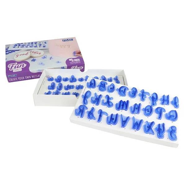 Sada 52 ks razítek písmen: 26 velkých a 26 malých. Vyrobeno z průhledného modrého plastu. Na každém razítku je šipka a vodící linka pro správné umístění směru písmene. Uloženo v kartónovém boxu, každá pozice písma je popsána. Velikost písmen: malé cca 15 mm, velké cca 30 mm Otisk písmene lze poté vybarvovat barvou, cukrovou polevou, královskou glazurou, čokoládou, obarveným piping gelem.