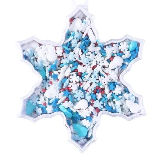 Ozdobte své sváteční dobroty sladkým cukrovým sypáním se zimním motivem! Balení v modro-bílo-červeném tónu obsahuje směs hvězdiček, sněhuláků, sněhových vloček, barevných tyčinek a dalších zimních motivů. Obsah balení je 72g. Posypky jsou uloženy v roztomilé, znovupoužitelné dóze ve tvaru sněhové vločky, která vypadá jako vánoční ozdoba – ideální i jako dárek pro milovníky pečení! Zdobení je vhodné na na cupcaky, dezerty, zmrzlinu, donuty, dortíky a jiné sváteční dobroty. Složení: Cukr, kukuřičný škrob, dextróza, plně hydrogenovaný palmový olej, zahušťovadla (E1442, E414, E415), dextrin, voda, protispékavá látka (E470b), aroma, lešticí látky (E904, E903), barviva (E133, E160a, E162), emulgátor (E322 (sója)). Alergen: sója Výživové hodnoty (ve 100g výrobku): Energetická hodnota: 1723 kJ/ 412 kcal; tuky 6 g (z toho nasycené mastné kyseliny 5,9 g); sacharidy 90 g (z toho cukry 61 g); bílkoviny 0 g; sůl 0,02 g.