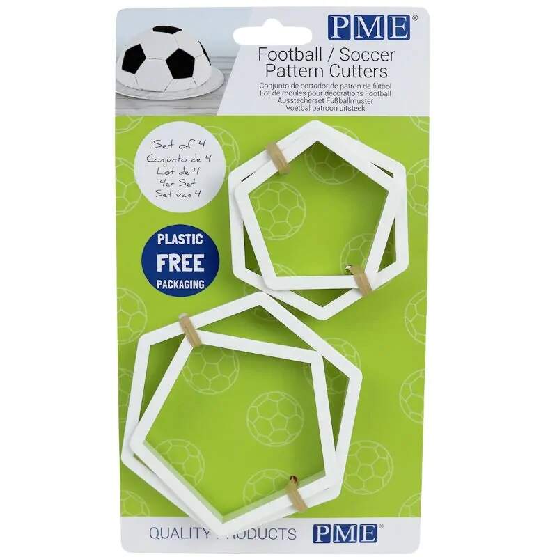 Praktická čtyřdílná sada plastových vykrajovátek na výrobů vzoru fotbalového míče. Sada se skádá vždy ze dvou částí, které na sebe navazují rozměry - jeden pětiúhelník a jeden šestiúhelník. Vykrajovátka jsou vhodná pro dva různé rozměry dortu-míče, a to s průměrem 15 cm a 20 cm. Rozměry: pětiúhelník menší - 5 x 5,4 cm pětiúhelník větší - 7 x 7,3 cm šestiúhelník menší - 5,8 x 6,6 cm šestiúhelník větší - 7,9 x 9 cm