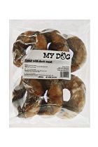 Popis: donut z bílé buvolí kůže obalený kachním masem. Pro psy. Složení: buvolí kůže 68%, kachní maso 20%, škrob 12%.