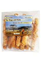 Rolka pro psy o průměru 3cm z vepřové kůže 16 cm omotaná kuřecím masem. složení: 70% vepřová kůže, 30% kuřecí maso.