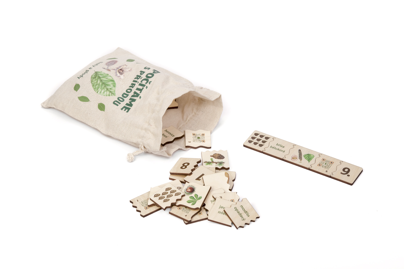 Počítáme s přírodou vyrábí u nás v dílně české ruce z kvalitního českého certifikovaného dřeva. Balení obsahuje 50 dílků (10 sestav) a návod. Každá sestava se skládá z pěti dílků, které obsahují reálný obrázek listu a plodu, siluetu listu nebo plodu, číslici, název a QR kód. Zabaleno v přírodním látkovém pytlíku s potiskem. Autorem kreseb jsou čeští ilustrátoři, obrázky jsou chráněny autorskými právy. Počítáme s přírodou je edukační hra se zvukovými QR kódy, se kterou poznáváte, počítáte a přiřazujete hravou formou dílky, které k sobě patří. NÁVOD: Cílem hry je přiřadit k obrázku listu a plodu správný název, siluetu listu nebo plodu, dílek s číslicí a dílek s QR kódem. S pomůckou můžete hrát hned několik her. Vyberte si jen některé dílky a přiřazujte pouze obrázek listu a plodu k názvu nebo spojujte siluety listů a plodů s číslicí. Každá sestava má svůj jedinečný tvar spoje, díky kterému do sebe zapadají jen ty dílky, které k sobě patří. Pomocí toho si zkontrolujete, zda jste přiřadili správné dílky. Po stažení aplikace "Lesní Svět" a načtení QR kódu, který naleznete na dílcích, si pustíte hlas zvířátka a dozvíte se spoustu dalších informací. Druhy dřevin: javor mléč, smrk ztepilý, jasan ztepilý, jírovec maďal, borovice lesní, buk lesní, dub zimní, modřín opadavý, bříza bělokorá, lípa malolistá. V nabídce máme variantu Stopy zvěře a Listy a plody. Lesní svět = značka s ekologickým certifikátem udržitelného hospodářství PEFC. Všechny výrobky jsou vyrobeny s ohledem na životní prostředí.