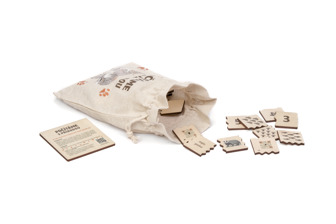 Počítáme s přírodou vyrábí u nás v dílně české ruce z kvalitního českého certifikovaného dřeva. Balení obsahuje 50 dílků (10 sestav) a návod. Každá sestava se skládá z pěti dílků, které obsahují obrázek zvířete, stopy, číslici, název a QR kód. Zabaleno v přírodním látkovém pytlíku s potiskem. Autorem kreseb jsou čeští ilustrátoři, obrázky jsou chráněny autorskými právy. Počítáme s přírodou je edukační hra se zvukovými QR kódy, se kterou poznáváte, počítáte a přiřazujete hravou formou dílky, které k sobě patří. NÁVOD: Cílem hry je přiřadit k obrázku zvířete správný název, stopu, dílek s číslicí a dílek s QR kódem. S pomůckou můžete hrát hned několik her. Vyberte si jen některé dílky a přiřazujte pouze zvíře k názvu nebo spojujte stopy a číslice. Každá sestava má svůj jedinečný tvar spoje, díky kterému do sebe zapadají jen ty dílky, které k sobě patří. Pomocí toho si zkontrolujete, zda jste přiřadili správné dílky. Po stažení aplikace "Lesní Svět" a načtení QR kódu, který naleznete na dílcích, si pustíte hlas zvířátka a dozvíte se spoustu dalších informací. V nabídce máme variantu Stopy zvěře a Listy a plody. Lesní svět = značka s ekologickým certifikátem udržitelného hospodářství PEFC. Všechny výrobky jsou vyrobeny s ohledem na životní prostředí.