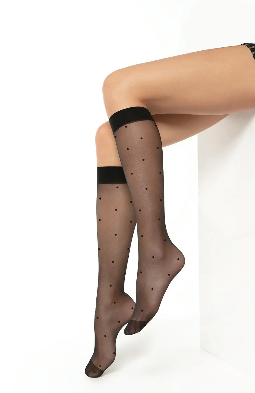 Dámské podkolenky - tečkovaná mikroretina - tloušťka 20 denierů - žebro s jemným volánem Složení: 89 % polyamid, 11 % elastan