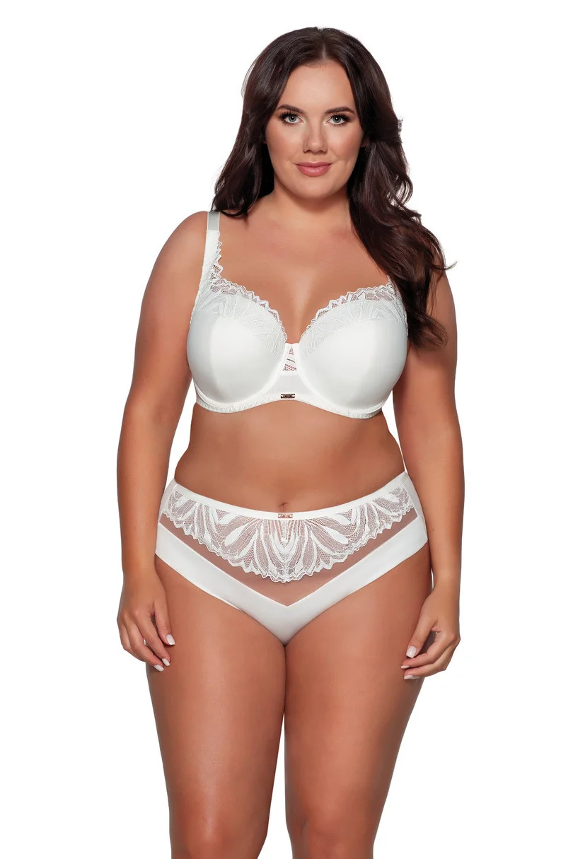 Biustonosz usztywniony, miseczki utrzymują piersi w swoich ryzach, zbierając je spod pach i solidnie podtrzymując. Dzięki elastycznemu obwodowi i dopasowanym ramiączkom biustonosz utrzymany jest stabilnie w odpowiednim miejscu, nie nadwrężając przy tym pleców i ramion. Koronka utrzymana w roślinnym motywie urokliwie wykańcza miseczki, pnąc się po ramiączku ku górze i prześwitując zalotnie w mostku, a metalowe logotypy AVA ulokowane z przodu i z tyłu dodają Yasemin odrobiny blasku. Skład: