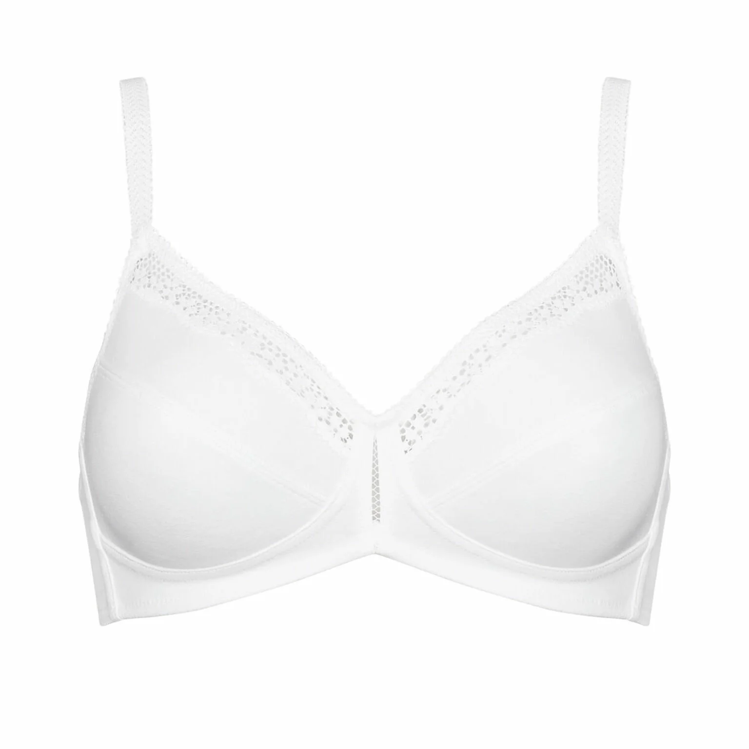 Navyztužená podprsenka bez kostic z příjemného materiálu, ve výstřihu zdobené košíčky všitou jemnou krajkou. Vyrobeno z vysoce kvalitní bavlny. Výstřih jemně zdobený jemnou a elastickou krajkou. Mezi košíčky je jemná mřížka, která zvýrazňuje poprsí. Možnost nastavení délky ramínek. Zapínání na háčky vzadu. Podprsenka má boční kostice, díky kterým dokonale podpírá a tvaruje poprsí. Materiálové složení: 80% bavlna, 10% polyamid, 10% elastan.