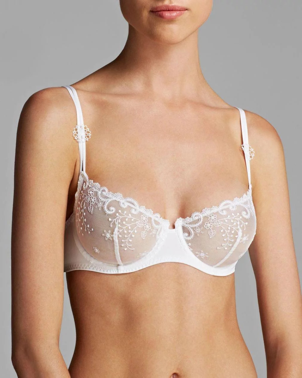 Balkonová podprsenka Simone Perélé Délice udělá otevřený dekolt a přesto prsa pozvedne. Má krásné vyšívané košíčky a špagetová ramínka zdobené výšivkou Guipure.
