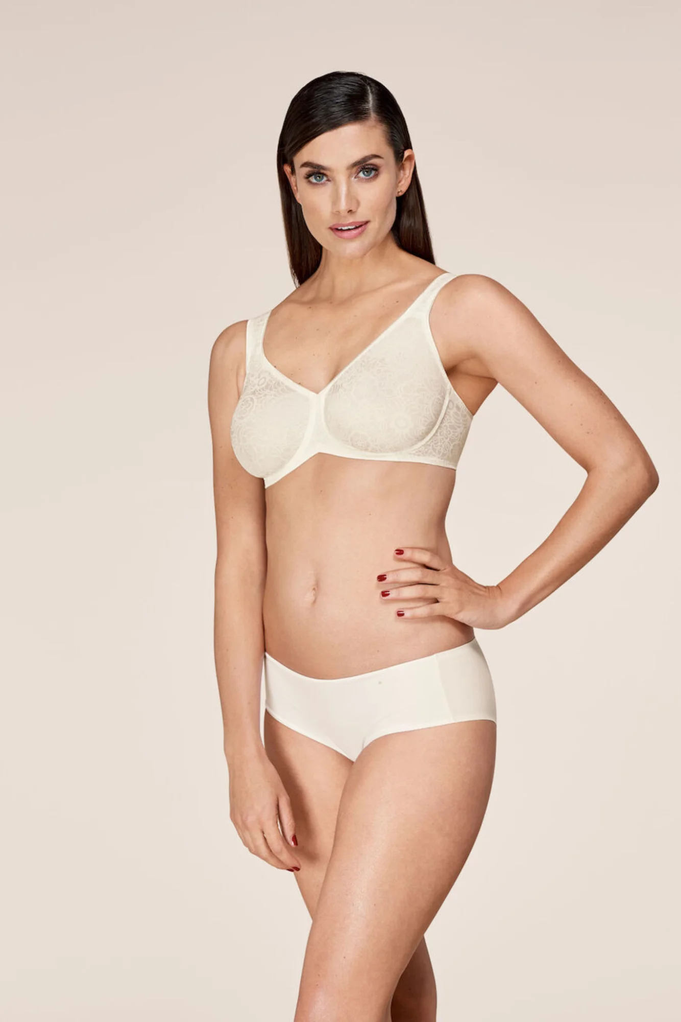 Elegantní, ale zároveň neuvěřitelně pohodlná podprsenka Triumph. Hladký materiál, jednotná barva, květovaný vzor. Zmenšuje opticky velikost prsou až o jednu velikost košíčku - Minimizer. S kosticemi, nastavitelné ramínka, klasické zapínání. Materiál: 82% Polyamid, 18% Elastan