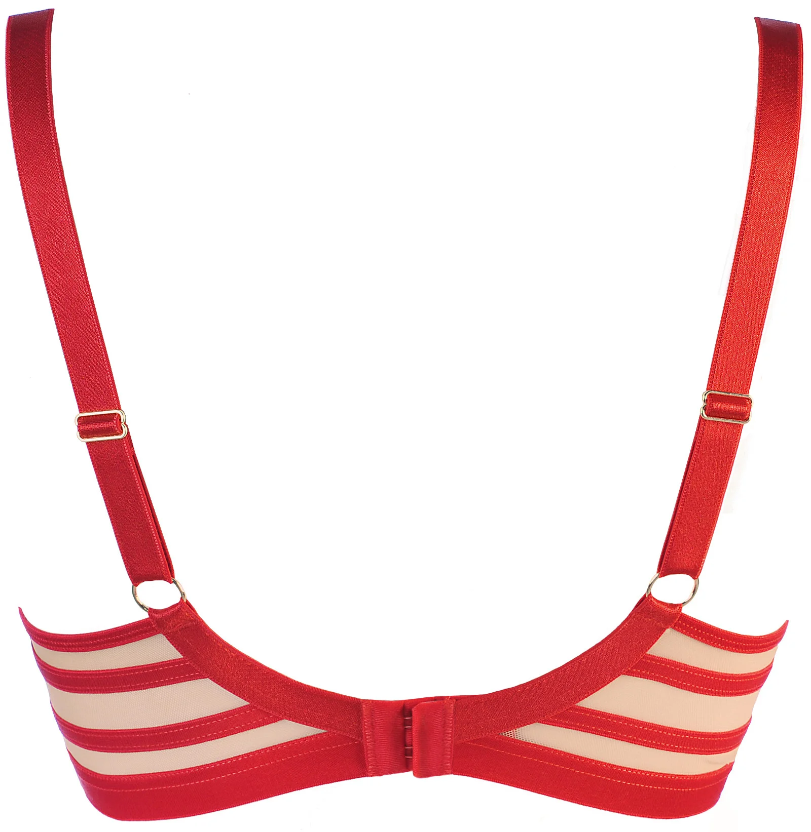 Lehký a žensky jemný model podprsenky je naším nejnovějším návrhem pro letní dny a opojné večery. Tato červená výšivka je bohatstvím fantazijních květů a okouzlujících ornamentů, které díky své průhlednosti jistě zaoblí linii poprsí a pozvednou je, aniž by zakryly jejich přirozenou krásu. Košíčky mají všitý drátek.Záda tohoto modelu jsou vyrobena z elastického tylu střídajícího se s červeným páskem, který se zapíná na dvouřadové zapínání na háčky a očka. Zlaté doplňky mezi prsy a na neodnímatelných ramínkách dodávají stylingu charakter.Složení látky: polyester 58 %, polyamid 40 %, elastan 2 %