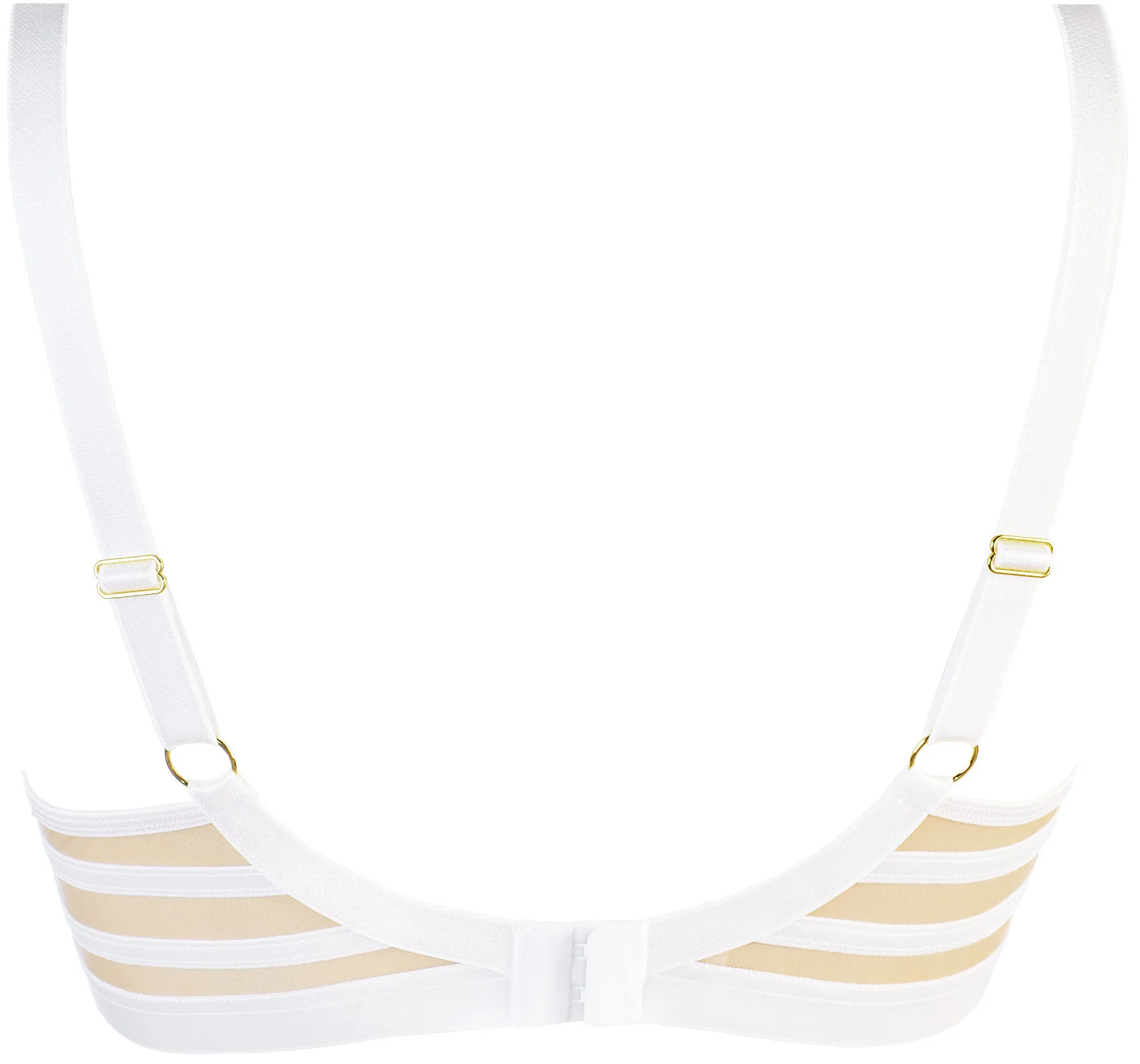 Nebesky fenomenální a vyzývavý bílý vyšívaný model od značky AXAMI je letní lehkostí, na kterou se musíte nechat zlákat. Ideální komplet pod tenké halenky a světlé outfity. Měkká podprsenka zvýrazňuje kulatost ňader a záda z průhledného tylu a bílých proužků dodávají stylingu lehkost. Na ramínkách a mezi prsy má ozdoby ve zlaté barvě. Košíčky jsou vyztužené drátky, ramínka jsou nastavitelná a neodnímatelná. Materiálové složení: polyester 58 %, polyamid 40 %, elastan 2 %