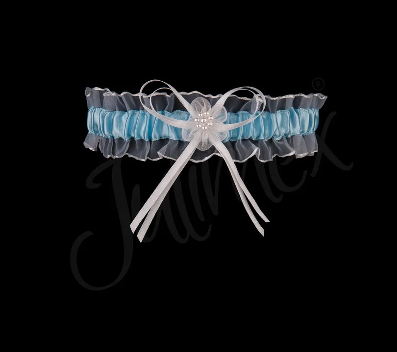 Bílý tyl a modrý saténový podvazek s ozdobou ve tvaru květu s našitými perlami. Složení 90 % polyester, 10 % elastan.