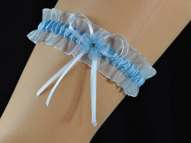 Modrý tylový a saténový podvazek zdobený květinovou mašlí s třpytivými flitry. Složení 90% polyester, 10% elastan. .