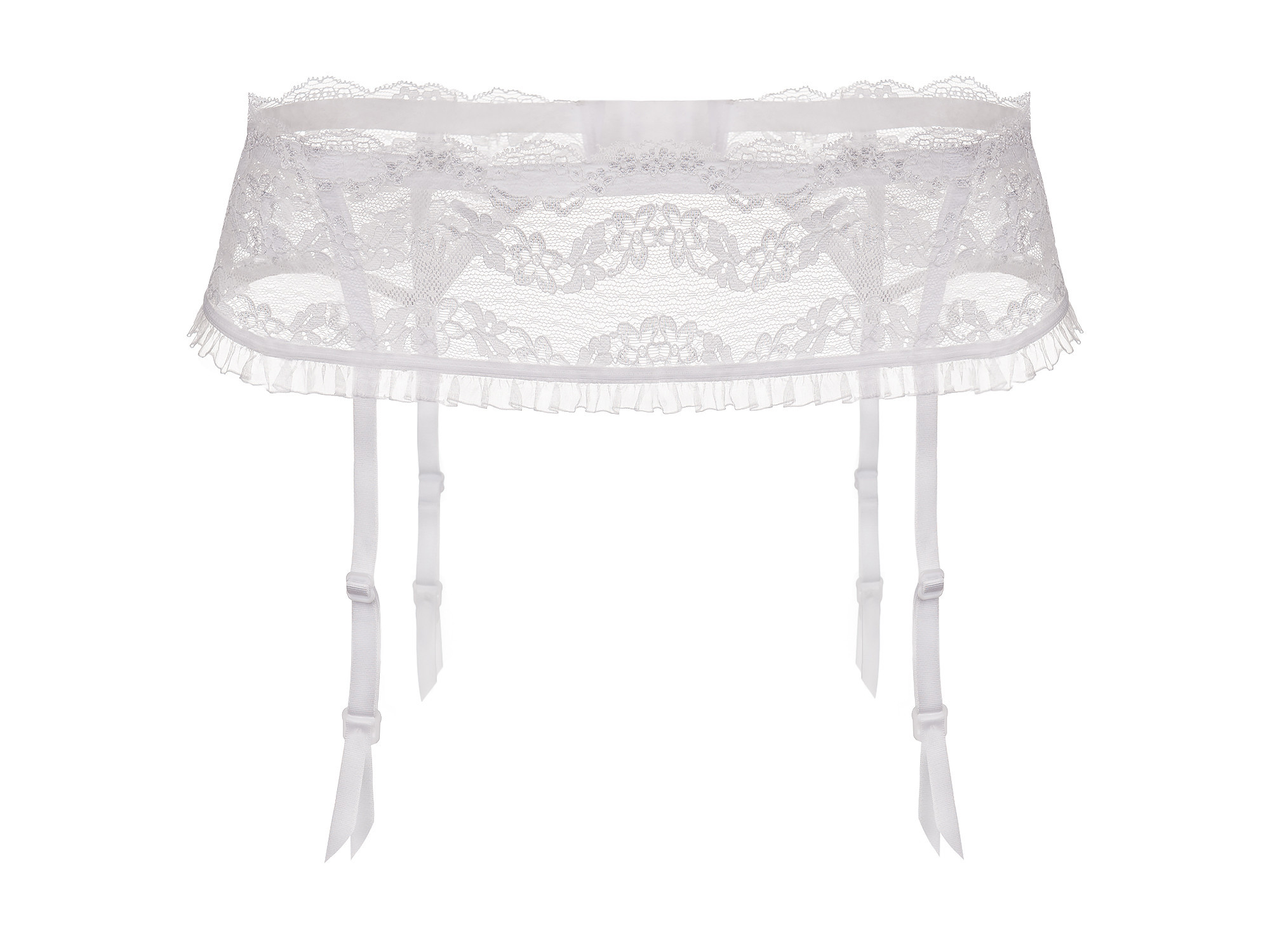 Efektní podvazkový pás se široké krajky s dvoustupňovým zapínáním na háčky, dole šňůrky pro nastavení délky. Materiálové složení: 88% polyester, 12% elastan.