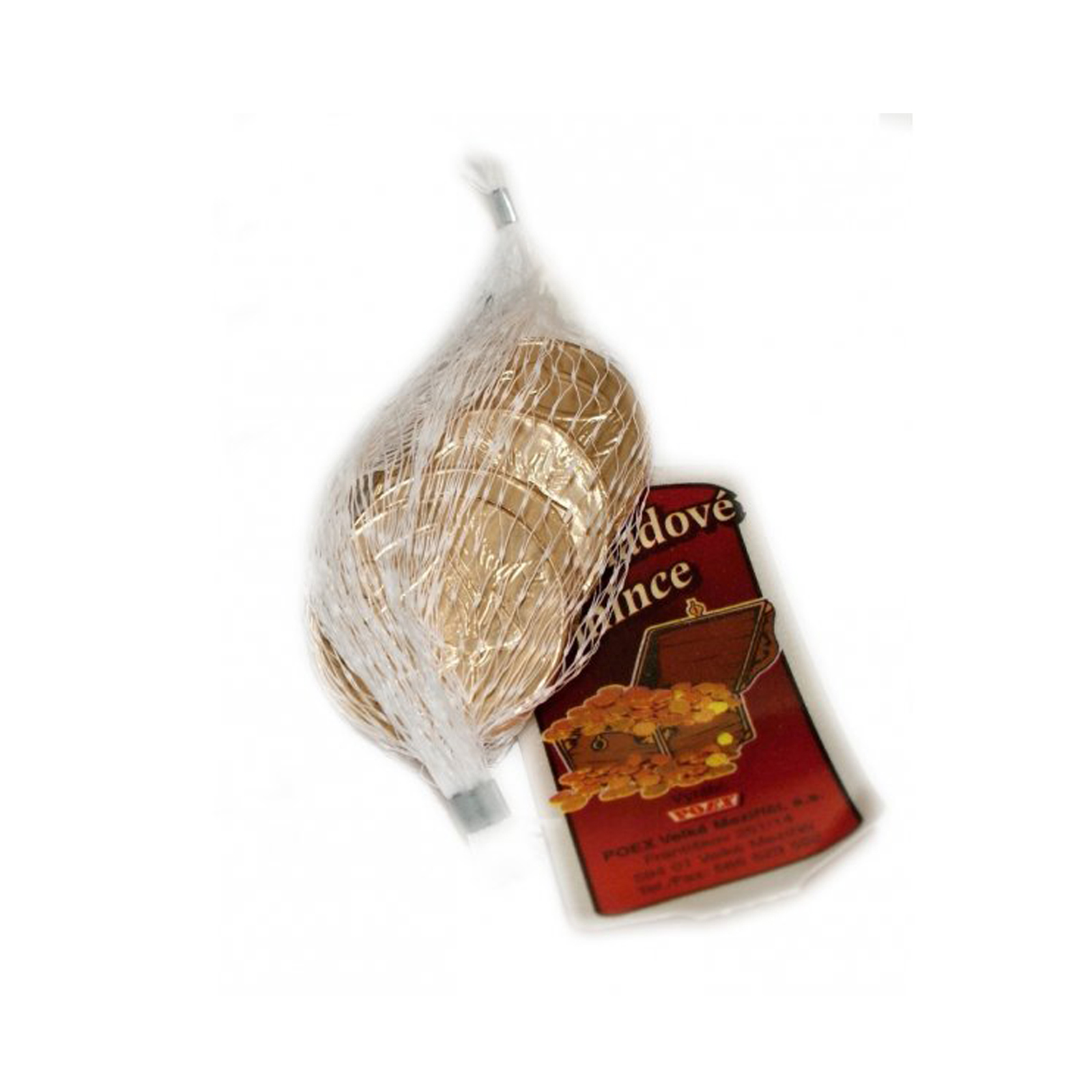 Čokoládové mince z mléčné čokolády v síťce. V jedné siťce je 13 mincí Mléčná čokoládaSložení:cukr, kakaové máslo, sušené plnotučné MLÉKO, kakaová hmota, rostlinné tuky (palmový olej, olej z máslovníku, Sal, olej z jader manga), sušená SYROVÁTKA, MLÉČNÝ TUK, LAKTÓZA, emulgátory: slunečnicový lecitin a polyglycerylpolyricinoleát; přírodní vanilkové aroma.V mléčné čokoládě obsah kakaové sušiny nejméně 25 %.Vedle kakaového másla obsahuje čokoláda rostlinné tuky.Výrobek může obsahovat stopy arašídů, skořápkových plodů, obilovin obsahujících lepek, sóji a sezamu.Výživové údaje na: 100 gEnergie 2347 kJ / 562 kcalTuky 34 g– z toho nasycené mastné kyseliny 19 gSacharidy 58 g– z toho cukry 56 gVláknina 1,8 gBílkoviny 5,2 gSůl 0,1 g