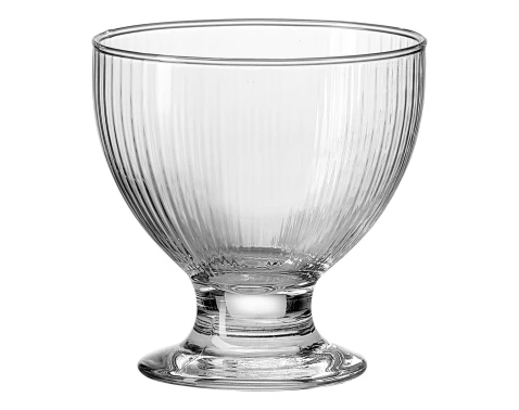 Skleněný pohár na dezerty 450 ml s jemným pruhovaným reliéfem je ideální pro servírování zmrzliny, pudinku či salátu.