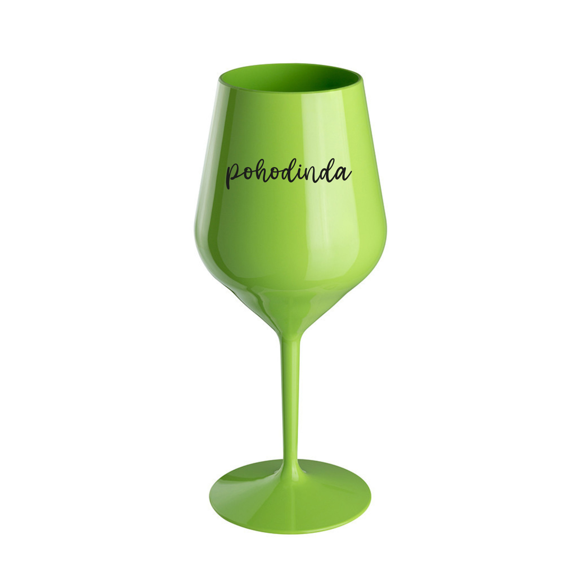 Nerozbitná zelená vinná sklenice s motivem POHODINDA je skvělá na zahradu, pláž, výlet, piknik a parádu udělá i při kempování. Jelikož je vyrobená z kvalitního polykarbonátu je de facto nerozbitná. Je to luxusní kousek, s nímž si víno můžete vychutnat prostě kdekoliv. Mají ergonomický tvar, který příjemně padne do ruky a protože je lehká, usnadňuje to její přenášení. Je snadno skladovatelná a lehce se čistí. Díky svému designu si s ní můžete vychutnat doopravdy kdekoliv bezproblémové pití výborného vína.