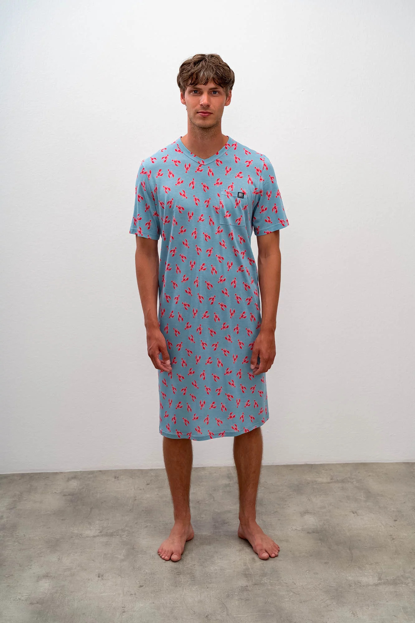 Pohodlná pánská noční košile pro dobrý a zdravý spánek. Noční košile je s krátkým rukávem, náprsní kapsičkou a výstřihem do V a zdobí ji račí potisk. Tato noční košile je vyrobena z vysoce kvalitní, genetický nemodifikované řecké bavlny, která poskytuje vysoké pohodlí, příjemný pocit na dotek, prodyšnost, pružnost a odolnost. Modalové vlákno je přírodního charakteru, je nesmírně poddajné a splývavé a zachovává svou měkkost, krásnou barvu a tvar i po mnoha vypráních. barva a vzor: blue niagara (modrá), račí vzor materiálové složení: 50 % přírodní bavlna, 50 % modal rukáv: krátký výstřih: do V délka košile: 110 cm model: výška 185 cm, velikost pyžama Medium (M)