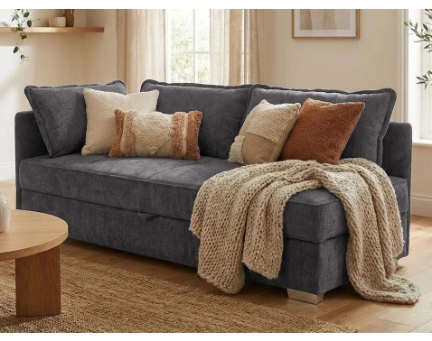 Tato praktická pohovka se třemi velkými opěrnými polštáři je očalouněna měkkou žinilkovou látkou v barvě kouřově šedá a kromě běžného sezení může být využita pro příležitostné nebo i trvalé spaní. Pod sedákem ukrývá praktický úložný prostor, kam lze uschovat lůžkoviny anebo třeba věci, které zrovna nepoužíváte. Boční opěrku lze univerzálně namontovat na pravou nebo levou stranu a pohovku si tak snadno přizpůsobit podle vaší potřeby.