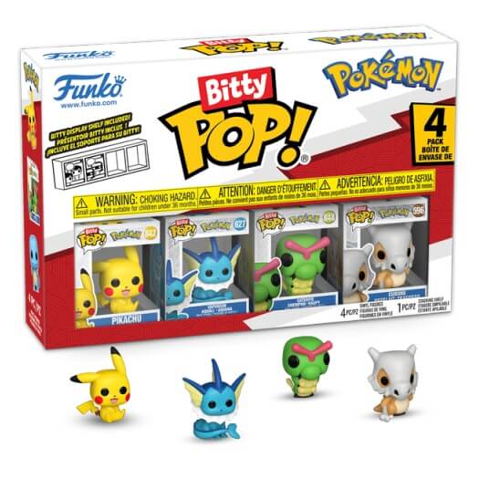 Vinylové minifigurky Pokémon Bitty POP! V balení naleznete figurky Pokémona Pikachu, Vaporeon, Caterpie a Cubone. Balení 4 minifigurek POP! vyrobených z vinylu. Každá měří přibližně 2 cm a je dodávána s vlastním akrylovým obalem v typickém designu POP! Součástí balení je stojan, který pojme všechny čtyři figurky. Figurky jsou vysoké přibližně 2 cm.