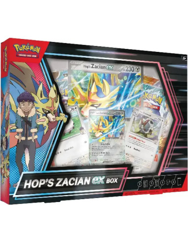 Speciální balení karetní hry Pokémon s foilovou promo kartou Hop’s Zacian ex! Obsah balení: • 1 foilová promo karta Hop’s Zacian ex • 2 foilové karty - Hop’s Wooloo a Hop’s Dubwool • 1 oversize foilová karta Hop's Zacian ex • 1 samolepka • 4 boostery Pokémon TCG • přístupový kód pro Pokémon TCG Live