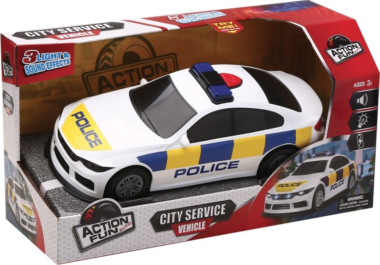 Policejní auto na setrvačník, se třemi zvukovými a světelnými efekty. Auto vyžaduje 2AA baterie, nejsou součástí balení. Pro děti od 3 let.