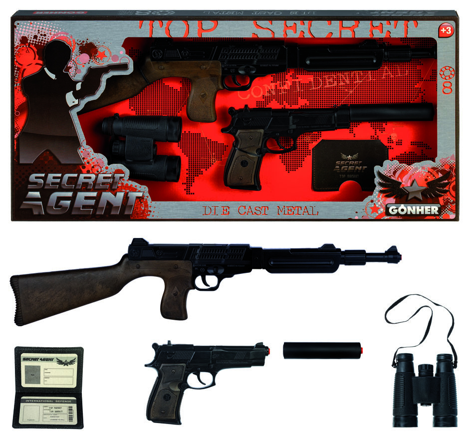 Policejní sada Top secret obsahuje kovovou policejní pistoli, tlumič, dalekohled, policejní průkaz + policejní pušku. Vše je vyrobeno z kovu. Vše je na kapslíky – 8 ran. Vyrobeno ve Španělsku.