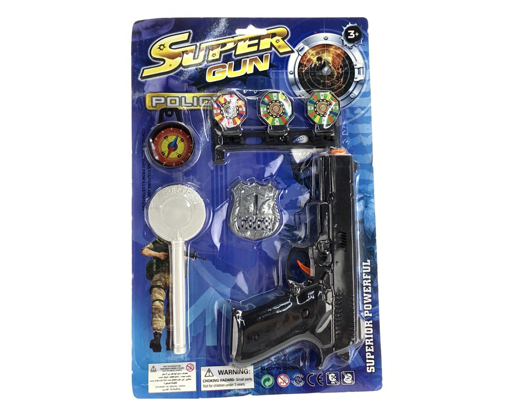 Sada pro malé policisty. Součástí sady je pistole, odznak, plácačka, terčíky a buzola. Vhodné pro děti od 3 let.