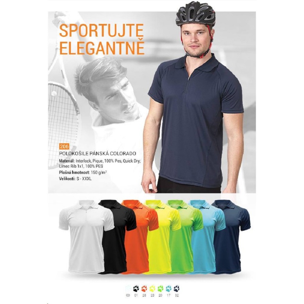 Polokošile funkční pánská sportovní Colorado Výborné FUNKČNÍ TRIKO vyrobené z materiálu Quick Dry – speciálně tvarované polyesterové vlákno zajišťuje rychlý odvod potu a tím vysoký uživatelský komfort. Konstrukce polokošile s raglánovým rukávem, límečkem a légou na zip. SPORTOVNÍ FUNKCE je zdůrazněna bočními tvarujícími panely s vyšší mírou cirkulace vzduchu z materiálu pique. Triko je VHODNÉ zejména pro sublimační TISK, ale i pro přímý tisk a transfer. Barva - white,jet black,blue atol,safety green,safety yellow,safety orange,dark navy Klíčové vlastnosti: •Funkční triko •Materiál Quick Dry (Rychle schnoucí) •Velmi příjemný na dotyk •Gramáž 150 g/m2 •Nízký límec a léga na zip - elegantní střih •Boční funkční panely pro lepší odvětrání •7 barev plus nové REFLEXNÍ - na každý den jedno triko! •Velikosti S-XXXL •Obrázky produktu zdarma pro