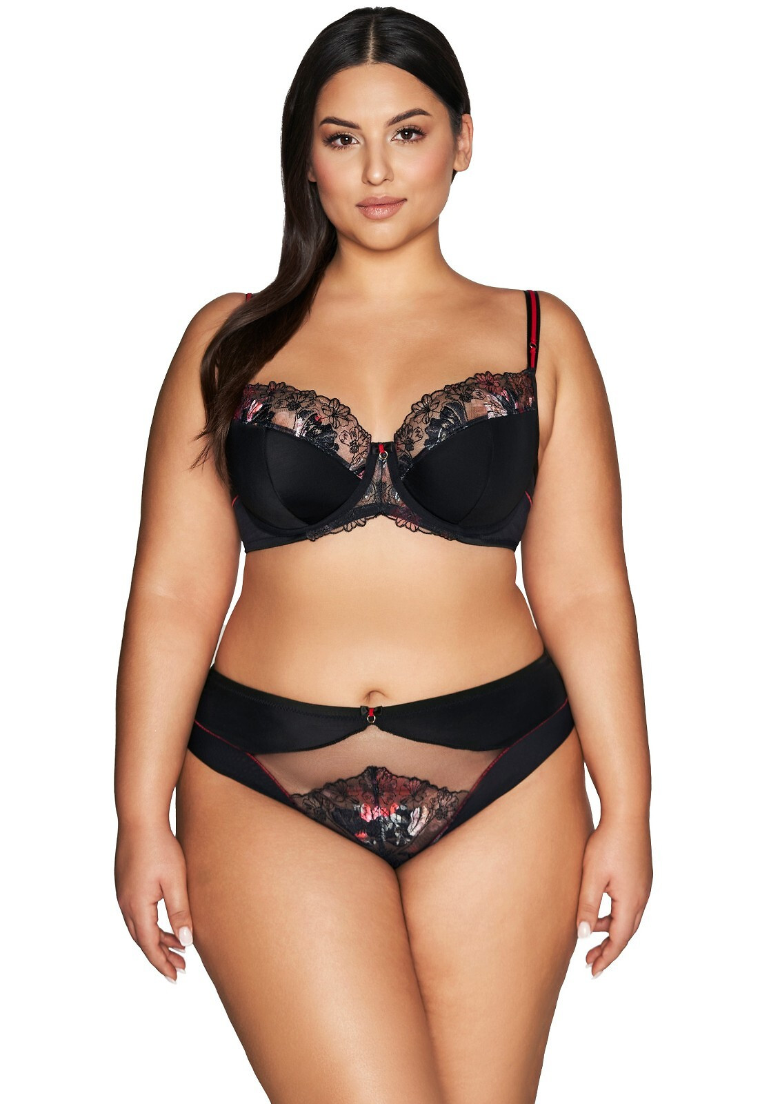 Poloměkká podprsenka s kosticí - třídílné košíčky z černého mikrovlákna - jemný tyl zdobený květinovou výšivkou na horní linii - boky z mikrovlákna bez bočního podšití - ramínka nastavitelná, neodnímatelná - červené detaily na ramínkách, podprsence a zádech dodávají výrazný nádech - třístupňové zapínání na dva nebo tři háčky - vynikající zvedání a sbírání prsou - struktura K-1030   Materiál: 88 % polyamid, 8 % bavlna, 4 % elastan