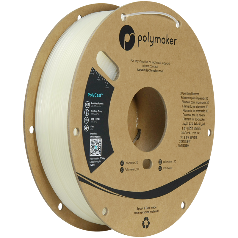PolyCast je speciální filament značky PolyMaker navržen pro tisk plastových forem využitelných ve slévárenství. Vyhlazení povrchu forem lze docílit pomocí běžně dostupných alkoholů (IPA či etanol), materiál přitom vytisknete na jakékoli FDM/FFF tiskárně. PolyCast™ byl speciálně vyvinut pro lití kovů (také známé jako metoda ztraceného vosku). Jaké jsou výhody PolyCast™ pro lití kovů? Při klasické metodě ztraceného vosku musíte nejprve vytvořit kovový nástroj k vytvoření voskových forem. Zpracování obvykle déle a náklady jsou relativně vysoké. 3D tiskem s PolyCast™ se použití těchto nástrojů sníží a úspora je vysoká. Nepopiratelnou výhodou PolyCast™ je rovněž to, že můžete s 3D tiskem vytvářet složité struktury, což s pomocí tradičních nástrojů není možné. V souhrnu je PolyCast ideální pro: Rychlou výrobu drobných kovových dílů. Kovové součásti se složitými geometriemi. PolyCast je první 3D tiskový filament, který byl speciálně navržen pro lití kovů. Má dvě důležité funkce: Vynikající kvalita povrchu Povrch PolyCast™ lze leštit v Polysher™ (pomocí patentované technologie Polymaker Micro-Droplet Polishing™), přičemž jsou eliminovány vrstvy a vytváří se velmi hladký povrch součástí. To je zásadní pro kvalitu kovových součástí. Hoření beze zbytků Většina polymerů zanechává při hoření zbytky - to by byl závažný problém při používání metody ztraceného vosku a mohlo by to vést k defektům kovových částí. Polymaker navrhl materiál tak, aby se úplně rozkládal a poskytoval hladkou formu pro lití. Je PolyCast™ snadné používat? Použití filamentu PolyCast™ je snadné. Tiskne se za typických podmínek PLA a je kompatibilní s téměř každou 3D tiskárnou založenou na filamentech. Společnost Polymaker vyvinula materiál, který nabízí skvělou tisknutelnost, rozměrovou stabilitu a snadné odstraňování podpůrného materiálu. Vytisknuté součásti mohou být následně vyleštěny v Polysher™, aby se výrazně zlepšila kvalita povrchu. Po vyleštění jsou komponenty připraveny k použití metody ztraceného vosku. PolyCast je termoplastický polymer jehož hlavní složkou je PVB (z tohoto materiálu se dělají také ochranné fólie na bezpečnostní skla). Tento filament má lepší mechanické vlastnosti než ABS i PLA. Nabízí zvýšenou rázovou odolnost, je rovněž flexibilní a nesmršťuje se. Lze proto tisknout díly velkých rozměrů a vysoké kvality bez obav z deformací. Kromě toho jej lze chemicky leštit pomocí alkoholu. Vzniknou díky tomu jedinečné kousky se zcela hladkým povrchem (layer-free). Skladujte v suchu, aby nedošlo ke zvlhnutí materiálu. Specifikace: Teplota tisku: 190 - 220 °C Teplota podložky: 25 -70 °C Rychlost tisku: 40 mm/s - 60 mm/s Tisk se zapnutým ventilátorem Teplota skelného přechodu (hranice použitelnosti): 70 °C Modul pružnosti v tahu: 2047 ± 111 Mpa Mez pevnosti v tahu: 39.8 ± 0.7 Mpa Balení: 0,75 kg Šířka struny: 1,75 mm Barva: Polymaker natural Stručný návod 1. Vytiskněte Vámi vybraný model na FDM 3D tiskárně. Doporučuje se tryska 0,4 mm, tisk s minimální výplní (např. 10 %) kvůli minimalizaci rizika poškození. Pozor na vlhkost, tento materiál je na ni náchylný. 2. Je-li to žádoucí, vyhlaďte vrstvy pomocí vaporizace alkoholovými výpary. Povrchová úprava bude mít velký vliv na odlévání. 3. Podle následujících pokynů vyleštíte vytištěný vzor PolyCast ™ KROK 1 (volitelný): K odstranění použijte brusný papír (zrnitost 800 nebo podobný), abyste odstranili hlavní švy nebo povrchové vady. Odstraňte prach a případné úlomky. KROK 2 Použijte materiál Polysher a postupujte podle návodu přípravku. Leštění může trvat 20 - 60 min. Další variantou je isopropyl alkoholu či ethyl alkoholu. Výtisk můžete ponořit do přípravu na 5 - 10 sek a nebo použijte sprej. KROK 3 Nechce výtisk půlhodiny vyschnout, zkontrolujte a v případě nutnosti opakujte postup. KROK 4 Vyleštěný výtisk vysušte ve vakuovačce či troubě na 40 °C alespoň po dobu jedné hodiny. aby se zcela odpařilo rozpouštědlo a povrchové kalení.