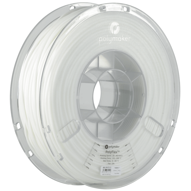 PolyFlex ™ TPU95 je vysoce kvalitní flexibilní materiál. Poskytuje dokonalé řešení pro aplikace, kde je vyžadována vysoká flexibilita a odolnost. Je to vlákno na bázi termoplastického polyuretanu (TPU), které je speciálně navrženo pro práci na většině stolních 3D tiskáren. Má tvrdost Shore 95A a může se protáhnout více než 3krát oproti původní délce. Skladujte v uzavíratelném sáčku, aby nedošlo ke zvlhnutí materiálu. Specifikace: Teplota tisku: 210 - 230 °C Teplota podložky: 25 -60 °C Rychlost tisku: 20 mm/s - 40 mm/s Tisk se zapnutým ventilátorem Tvrdost Shore 95A Balení: 0,75 kg Šířka struny: 1,75 mm Barva: bílá