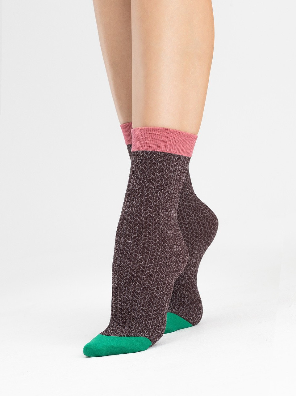 Vzorované ponožky, které jsou vyrobené z mikrovlákna s jemností 80 DEN. Ponožky jsou ozdobené jemným vypouklým vzorem. Lem modelu má kontrastní barvu. Složení: 40 % polyester, 33 % polyamid, 15 % polypropylen, 12 % elastan.