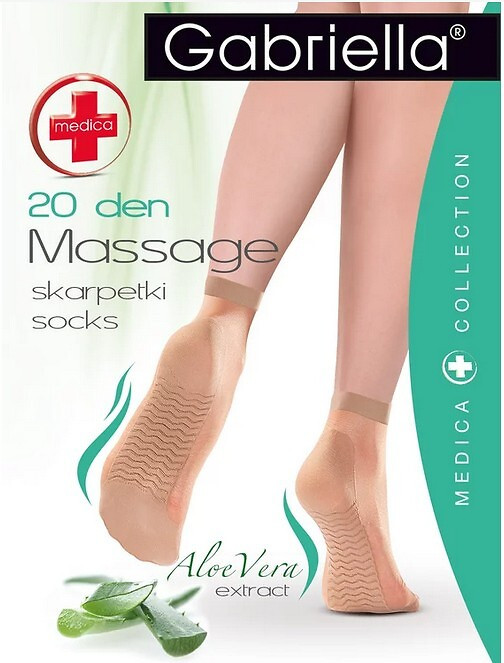 Dámské ponožky 20 den - z elastických vláken - s netlačícím lemem - profilované chodidlo - speciálně navržená část na chodidle - masážní účinek na chodidla - podporuje účinek proti křečím - zklidňující výtažek z aloe vera Složení: 85 % polyamid, 15 % elastan