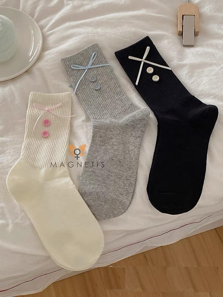 Dámské módní ponožky - měkký úplet s jemným žebrováním - zdobené mašlí a knoflíky Složení: 80 % bavlna, 15 % polyester, 5 % elastan