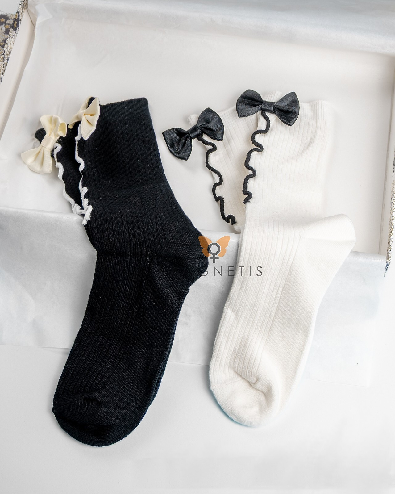 Dámské módní ponožky - měkký úplet s jemným žebrováním - zdobené kontrastním prošíváním a mašlí Složení: 92 % bavlna, 8 % elastan