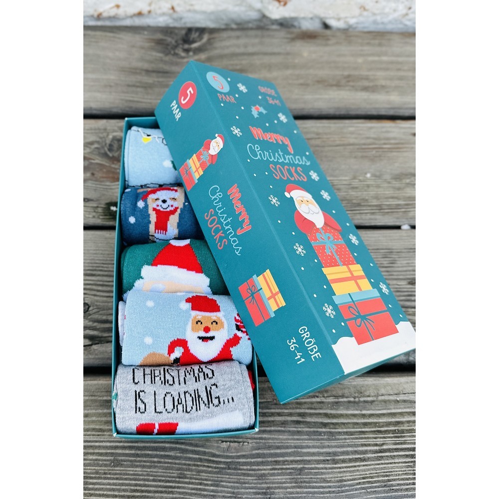 Ponožky merry christmas socks 5 párů Sada krásně vzorovaných bavlněných ponožek s vánočními motivy v dárkovém balení. Veselé ponožky vám udělají radost v každém okamžiku. Složení: 61% bavlna, 36% polyester, 3% elastan Velikosti 36-41 42-46 Balení 5 párů (různé vánoční motivy)