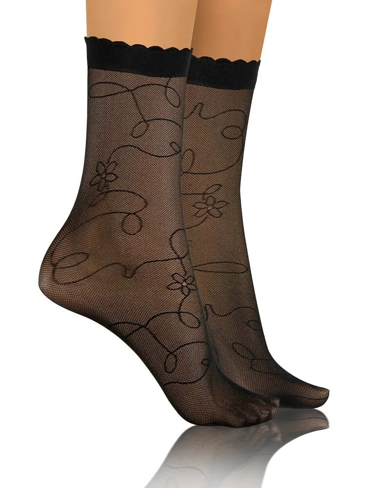 Tenké dámské ponožky - zdobené jemným vzorem - klasický hladký lem - baleno po dvou párech v plastovém sáčku Složení: 91 % polyamid, 9 % elasta