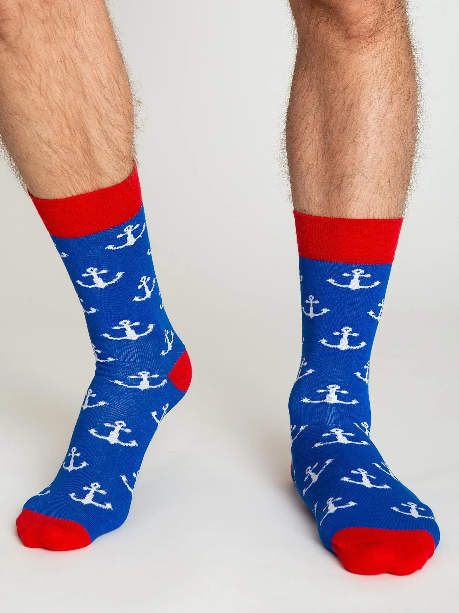 Pánské bavlněné ponožky s tmavě modrými vzory. materiál: 80 % česaná bavlna, 17 % polyamid, 3 % elastan způsob praní: praní v pračce na 40 °C