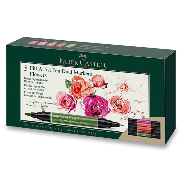 Sada 5 ks moderního uměleckého oboustranného popisovače Faber-Castell Pitt Artist Pen Dual Marker pro tušové skicování, kreslení a malbu. Popisovač má měkký štětec pro uměleckou práci a tenký hrot v kovovém pouzdře pro jemné linky kontur a detailů. Změnou úhlové polohy a změnou tlaku je možné vytvořit různé šířky čar. Šíře stopy hrotu 0,8 mm. umělecký inkoustový popisovač se dvěma hroty, vysoce pigmentovaný inkoust na vodní bázi, vysoce odolný proti světlu, robustní a zároveň flexibilní štětečkový hrot pro uměleckou práci, stabilní vláknový hrot (0,8 mm) v kovovém pouzdře pro obrysy, podrobné detaily a přesné linie, neprosakuje skrz papír, ideální pro umělecká díla a expresivní kresbu Zakupte produkt Popisovač Faber-Castell Pitt Artist Pen Dual Marker Flowers sada 5 ks z kategorie Výtvarné potřeby | Kreativita | Fixy, popisovače od výrobce Faber-Castell za cenu 465 Kč.
