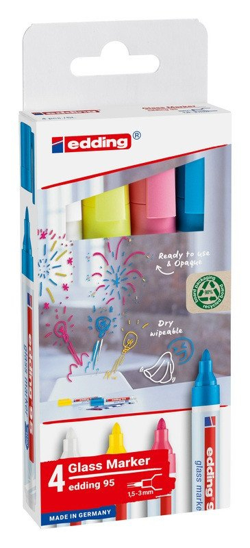 Popisovač edding 95 na všechny skleněné povrchy. Inovativní inkoust nabízí vynikající krycí schopnost - zářivé barvy zajistí, že je stopa i na barevném skle dobře viditelná. Popisovač využijete na sklo, skleněné tabule, zrcadla i na bílé tabule. Praktickou vlastností je smazatelnost stopy zasucha - není nutné používat vlhký hadr. Inkoust je rychleschnoucí a nezanechává žádný mastný film. Popisovač je ihned použitelný - stačí sejmout víčko a psát. Užitečný je především při prezentacích, schůzkách i při běžném zapisování poznámek a myšlenek. Ideální je také pro dočasné vzkazy na zrcadlech nebo pro vyzdobení oken. Sada 4 barev: bílá, žlutá, růžová a světle modrá. Barvy žlutá a růžová jsou fluorescentní pod UV lampou. Kulatý hrot. Šíře stopy: 1,5-3 mm. Kartonový obal (z 90 % karton certifikovaný FSC). Vyrobeno v Německu.