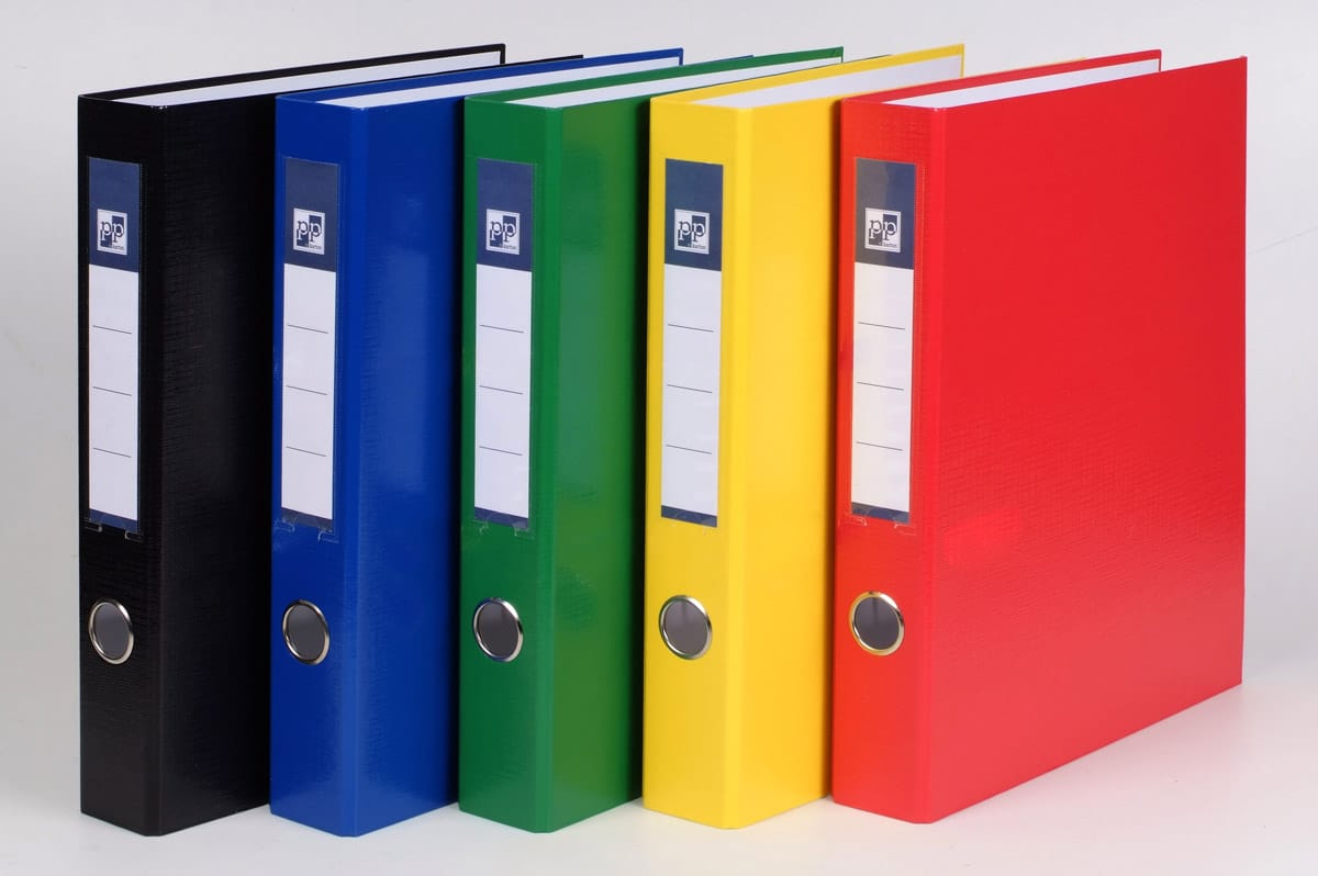 Pákový lamino pořadač, hřbet šířka 5 cm, hřbetní kapsa a prstokroužek. Radokroužky na přední straně proti samovolnému rozevírání pořadače.
