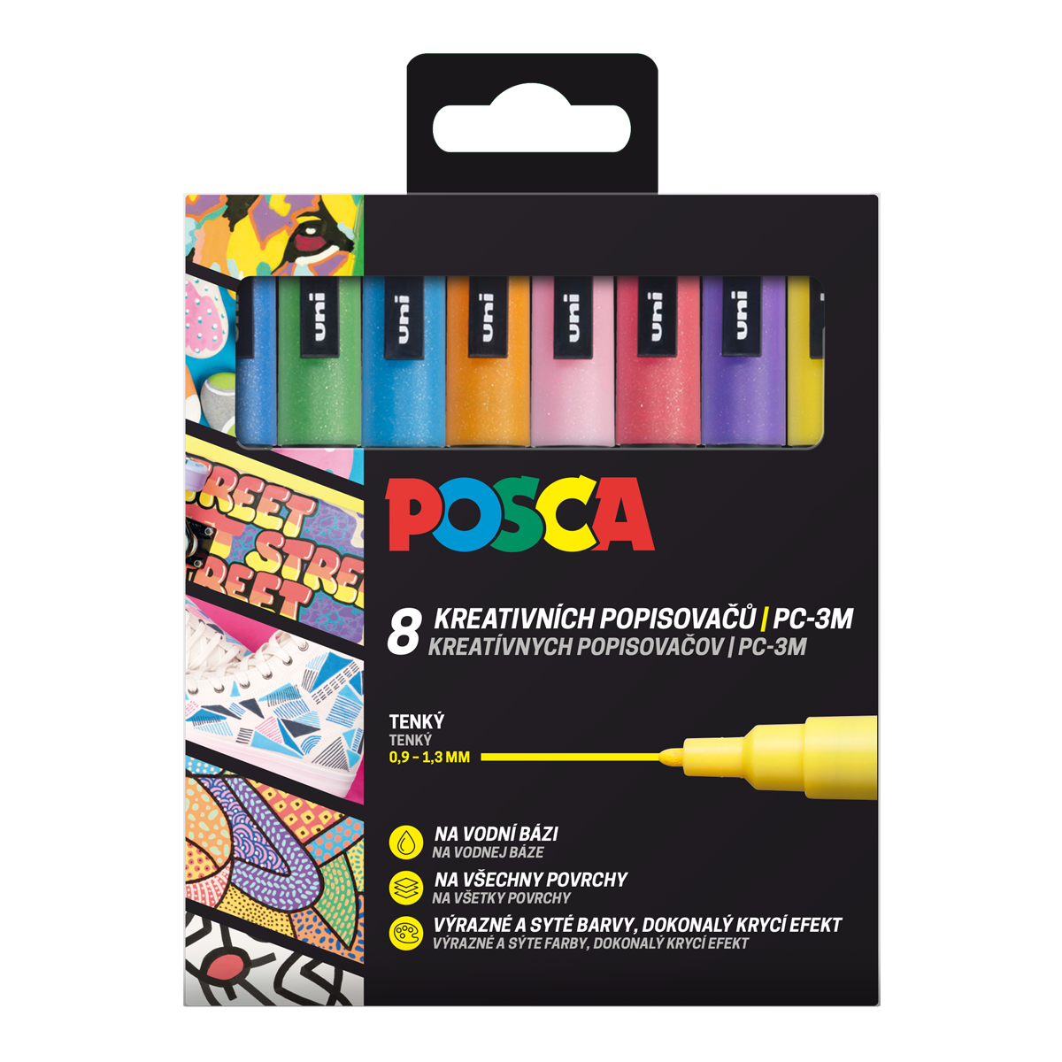 Dekorační akrylový popisovač vhodný na různé povrchy.. Univerzální popisovač Posca se zakulaceným hrotem patří do rukou odborníků. PC-3M je určen pro úpravu, tvoření, dekoraci a popis všeho, co potřebuje pevnou linku. Obsahuje bezkonkurenční inkoust, jehož složení se od svého vytvoření nezměnilo, je mimořádně bohatý na pigmenty a je extrémně odolný vůči atmosférickým podmínkám a plynutí času. Jeho matné barvy mají velkou hloubku - umělci je milují pro svá díla a fandové jsou ohromeni „magickým“ efektem Posca. Obsahuje jedinečný ventilový mechanismus, který zaručuje perfektní utěsnění a šetří barvu v průběhu času. Stejný mechanismus se používá k naplnění popisovačů Posca pro použití a k opětovnému nasycení špičky tak často, jak je to nutné během tvoření. Barva je velmi bohatá na pigmenty, čímž vykazuje výsledky vynikající hustoty. Jeho jedinečné složení na vodní bázi poskytuje jasné, matné, neprůhledné barvy, které opravdu vydrží. Je bez zápachu. Barvy jsou vrstvitelné, mísitelné, vodou rozpustné, odolné vůči povětrnostním vlivům a nabízejí neomezené kreativní možnosti. Vyrobeno v Japonsku. Balení: 8 ks