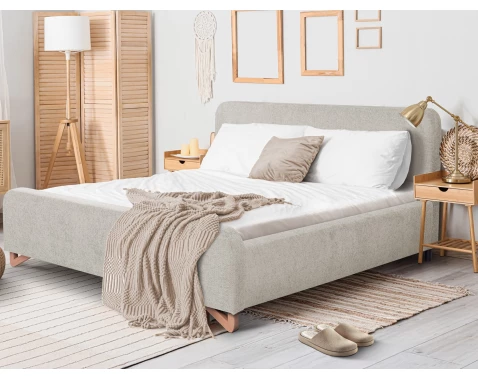 Elegantní postel o velikosti lůžka 180x200 cm má zaoblený tvar čela a útulné dřevěné nohy. Očalouněna sametově hebkou tkaninou v barvě světlá šedo-béžová.