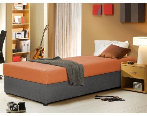 Jednolůžková postel (válenda) 88x202 cm s roštem, matrací a úložným prostorem, potažená šedo-oranžovou látkou, je praktickým a stylovým řešením pro každý pokoj.