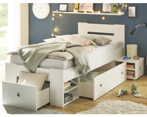 Praktická postel s nočním stolkem, úložnými zásuvkami a bočním regálem je ideální nejen do malého prostoru. Plocha lůžka 90x200 cm, vyrobena v bílé barvě.