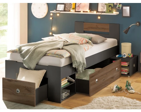 Maximálně praktická postel s nočním stolkem, úložnými zásuvkami a bočním regálem je ideální nejen do malého prostoru. Plocha lůžka 90x200 cm.